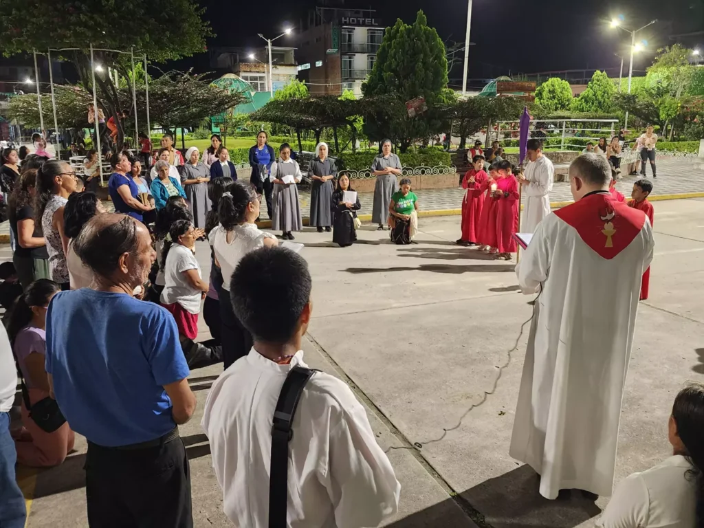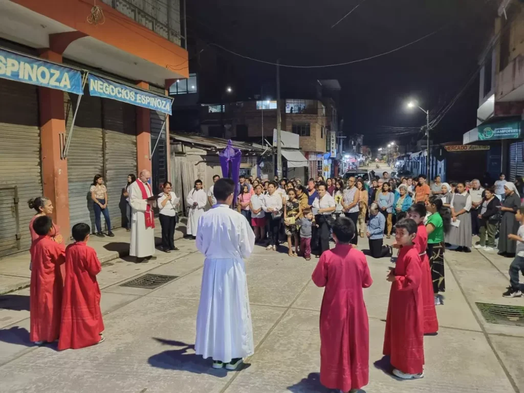 El recorrido inició al caer la tarde en la Iglesia Parroquial del distrito, desde donde los participantes, portando velas y entonando cantos penitenciales, siguieron las 14 estaciones que rememoran el camino de Jesús hacia el Calvario. Las calles se transformaron en un espacio de meditación y encuentro con el misterio del amor redentor de Cristo.